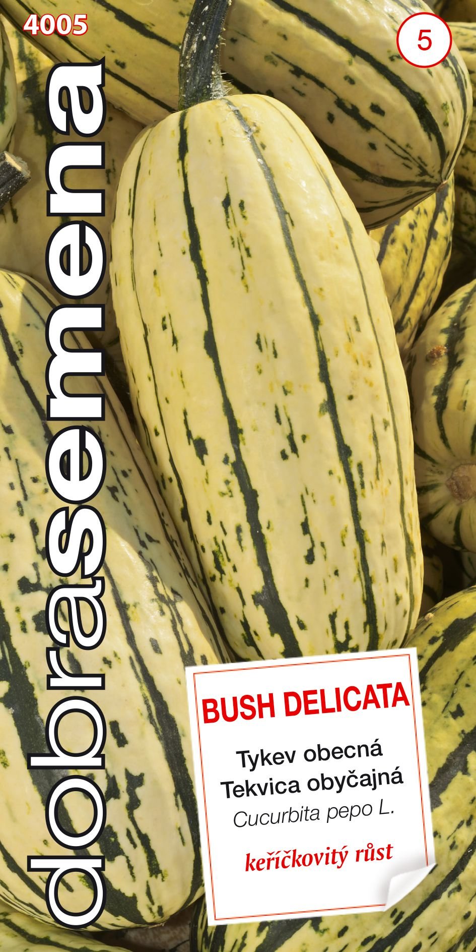| BUSH DELICATA - poloplazivá rostlina s kratšími výhony. Plody jsou podlouhlé, smetanově bílé, s podélnými zelenými pruhy. Dosahují hmotnosti kolem 0, 5 kg a jsou oblíbené na pečení a plnění. Během léta můžete průběžně sklízet mladé plody. Plně vyzrálé plody, sklizené na podzim, jsou výborně skladovatelné v suchu a při teplotě nad 12 °C. Popis SK: |