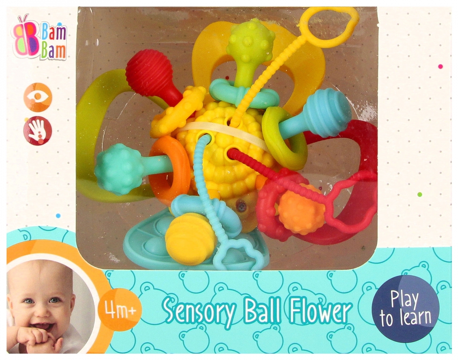 KULA SENSORYCZNA BAM BAM pozwala na doskonalenie umiejętności manualnych i motoryki małego dziecka w pełnym zakresie. Łatwość jej utrzymania w małej dłoni, chwycenia, potrząsania, zginania doskonale mobilizuje dziecko do manewrowania i manipulacji paluszkami, zapewniając mu przy tym długą zabawę. Intensywne kolory wypustek grzechotki stymulują jego percepcję wzrokową, a zróżnicowana tekstura, zmysł dotyku. Zabawka wykonana z najwyższej jakości plastiku oraz gumy bez ftalanów, zgodna z EN-71 i CE zapewnia bezpieczną zabawę. Wymiary/waga/baterie wymiary produktu dł. x wys. x gł. cm 14x14x14, wymiary opakowania dł. x wys. x gł. cm 18x14x14, waga produktu bez opakowania kg 0,10 kg, waga produktu w opakowaniu kg 0,20 kg, nie wymaga zasilania bateriami. Zabawka przeznaczona dla dzieci w wieku 4m . Pakowana w kartonik z okienkiem.