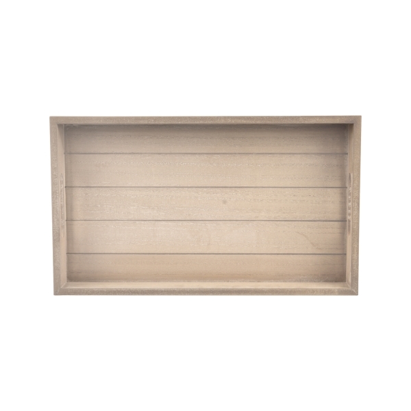 Stylový servírovací tác z lisovaného dřeva, o velikosti 34x20 cm, se bude díky přírodnímu tónu a decentní bílé patině hodit pro servírování a přenášení snídaně, dezertu k odpolední kávě i pochoutek na terasu.
