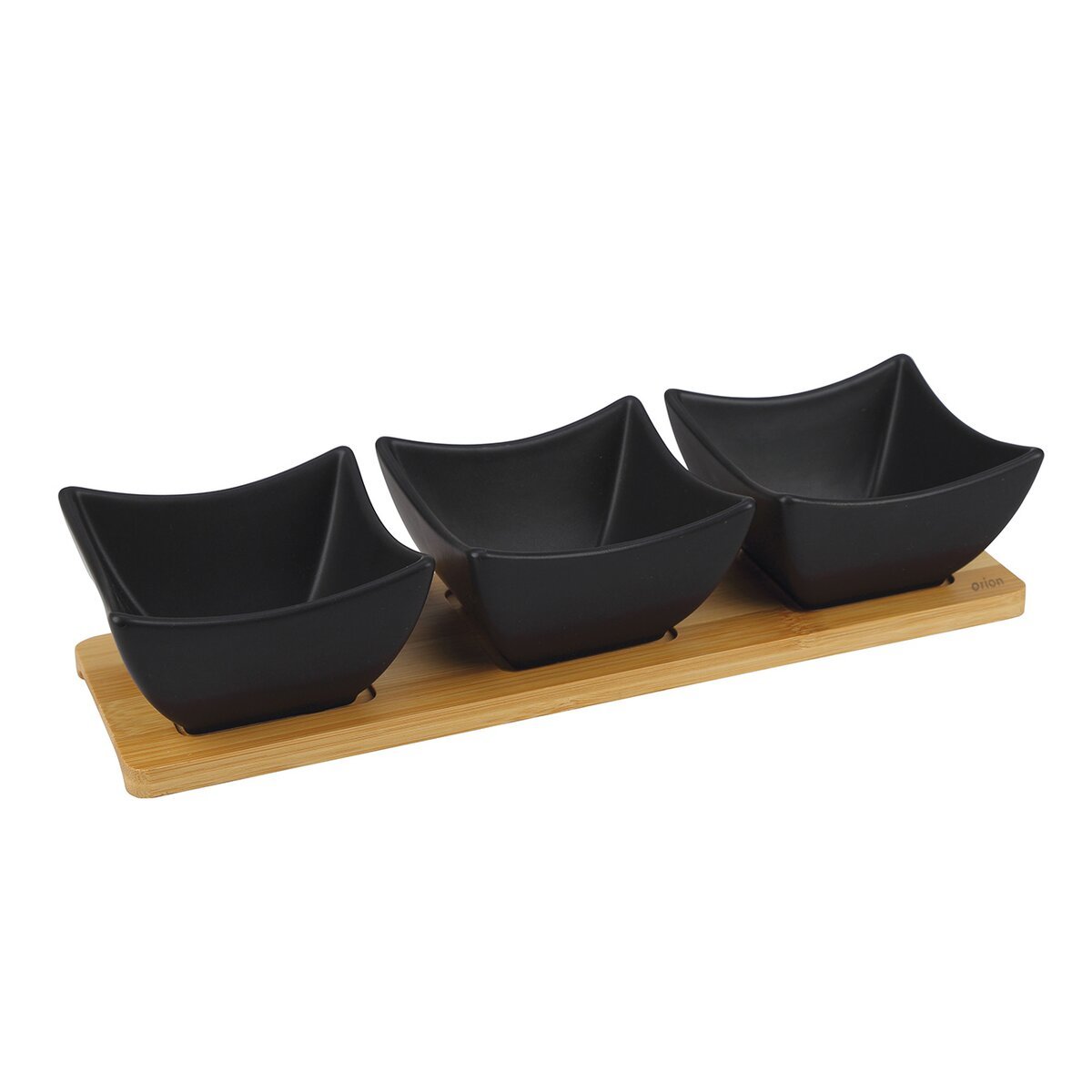 Servírovací set tří hranatých misek na tácku využijete k servírování pohoštění rodině nebo hostům. Vhodné na olivy, uzeniny, sýry, dipy, oříšky, zeleninu... Materiál: porcelán, bambus. Rozměry: miska o. 0,25 l, 10x10x5,5 cm, tác 31,5x9x1 cm, celkově 31,5x10x7,5 cm. Porcelánové misky lze mýt v...