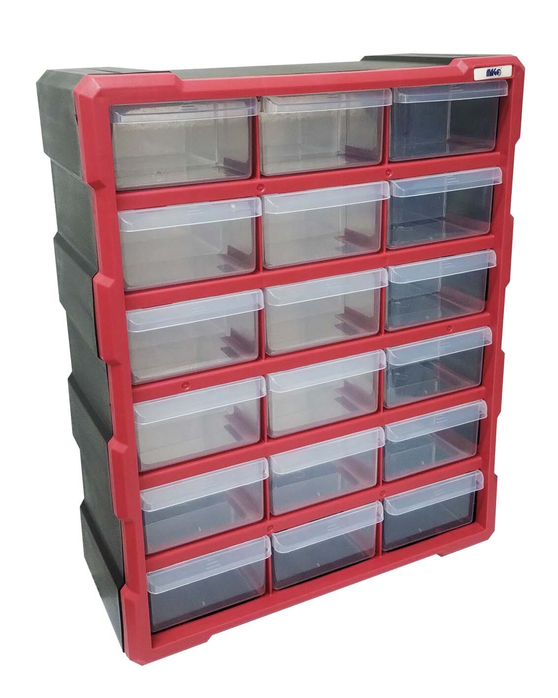 Plastová skříňka s 18 šuplíky je nezbytnou úložnou možností pro vaši dílnu. Je ideální pro uložení drobných předmětů, jako jsou vrtáky, šrouby, hřebíky, matice, podložky, kleště, šroubováky a mnoho dalšího. Skříňka je vyrobena z odolného plastu. Díky průhledným zásuvkám budete mít vždy přehled o uložených předmětech.- Vyrobena z houževnatého plastu pro odolnost a pevnost (PP).- Lehká a snadno se přenáší.- Ideální pro organizaci pracovního prostoru.- S možností zavěsit na zeď.- Snadná viditelnost obsahu díky průhledným plastovým zásuvkám.- Vyjímatelná plastová přepážka v každé zásuvce.- Zásuvky jsou opatřeny zarážkami proti nechtěnému vysunutí.Počet šuplíků: 18 velkýchMateriál: PPHmotnost: 2,33 kgCelkové rozměry (v x š x h): 470 x 380 x 160 mmRozměr velkého šuplíku (v x š x h):Vnější rozměr včetně držátka: 60 x 112 x 155 mmVnitřní rozměr: 58 x 108 x 138 mmNosnost šuplíku: 2,5 kg
