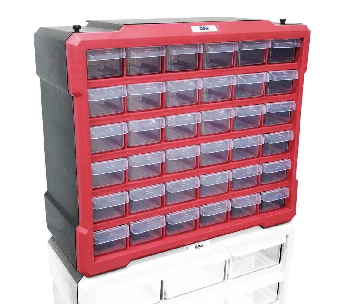 Plastová skříňka s 36 šuplíky je nezbytnou úložnou možností pro vaši dílnu. Je ideální pro uložení drobných předmětů, jako jsou vrtáky, šrouby, hřebíky, matice, podložky, kleště, šroubováky a mnoho dalšího. Skříňka je vyrobena z odolného plastu. Díky průhledným zásuvkám budete mít vždy přehled o uložených předmětech.- Vyrobena z houževnatého plastu pro odolnost a pevnost (PP).- Lehká a snadno se přenáší.- Ideální pro organizaci pracovního prostoru.- S možností zavěsit na zeď.- Snadná viditelnost obsahu díky průhledným plastovým zásuvkám.- Vyjímatelná plastová přepážka v každé zásuvce.- Zásuvky jsou opatřeny zarážkami proti nechtěnému vysunutí.Počet šuplíků: 36 malýchMateriál: PPHmotnost: 2,09 kgCelkové rozměry (v x š x h): 330 x 380 x 160 mmRozměr malého šuplíku (v x š x h):Vnější rozměr včetně držátka: 38 x 55 x 155 mmVnitřní rozměr: 35 x 50 x 138 mmNosnost šuplíku: 1,0 kgSkříňky 120296 a 120297 jsou navzájem stohovatelné.