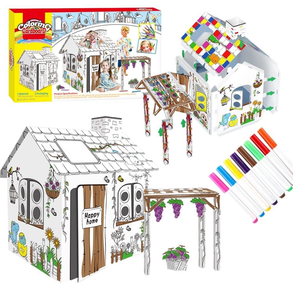 Duży domek z tektury kartonowej do kolorowania to doskonały sposób na długie godziny zabawy, a także rozwój zdolności manualnych, wyobraźni oraz kreatywności dla malucha.