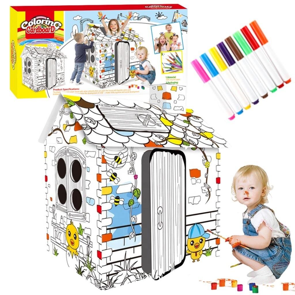 Duży domek z tektury kartonowej do kolorowania to doskonały sposób na długie godziny zabawy, a także rozwój zdolności manualnych, wyobraźni oraz kreatywności dla malucha.