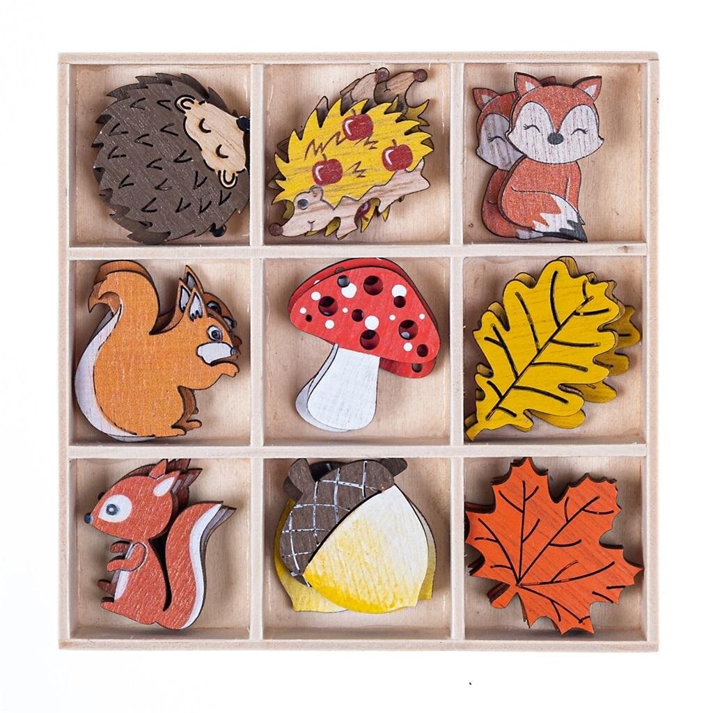Kształty z drewna o leśnej tematyce utrzymane w jesiennej kolorystyce. W zestawie znajdziesz urocze wiewiórki, rudego liska, jeże, muchomorki, żołędzie i jesienne liście. Wszystkie elementy są pomalowane i nie wymagają dodatkowego zdobienia.
