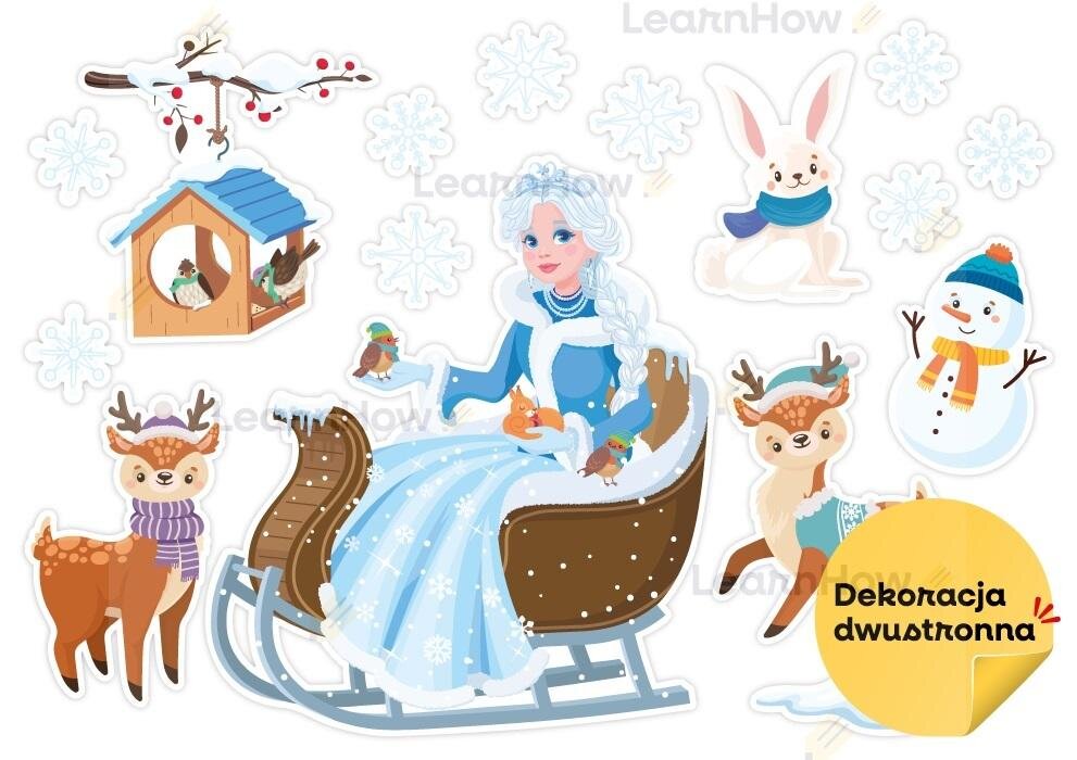 Zestaw składa się z dużej postaci Pani Zimy w saniach, 2 reniferów, bałwanka, zajączka, karmnika na gałęzi, śnieżnej zaspy oraz 9 śnieżynek.