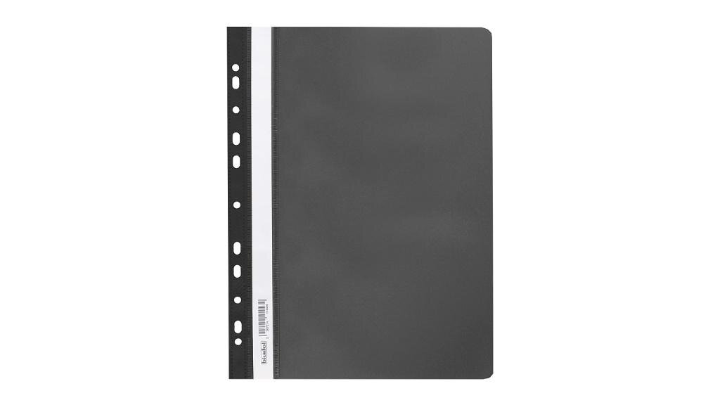Skoroszyt wykonany z polipropylenu, miękki, przód przezroczysty, tył kolorowy. Europerforacja umożliwiająca wpięcie do segregatora z dowolnym ringiem. Wewnątrz klasyczny mechanizm z wąsem i listwą skutecznie zabezpieczający wpiętą zawartość; wąs o długości 14,5 cm. Na bocznej krawędzi wymienny, papierowy pasek do opisu zawartości z kodem kreskowym na szt. Dwa wycięcia ułatwiające wysuwanie paska. Zaokrąglone rogi obu okładek.
