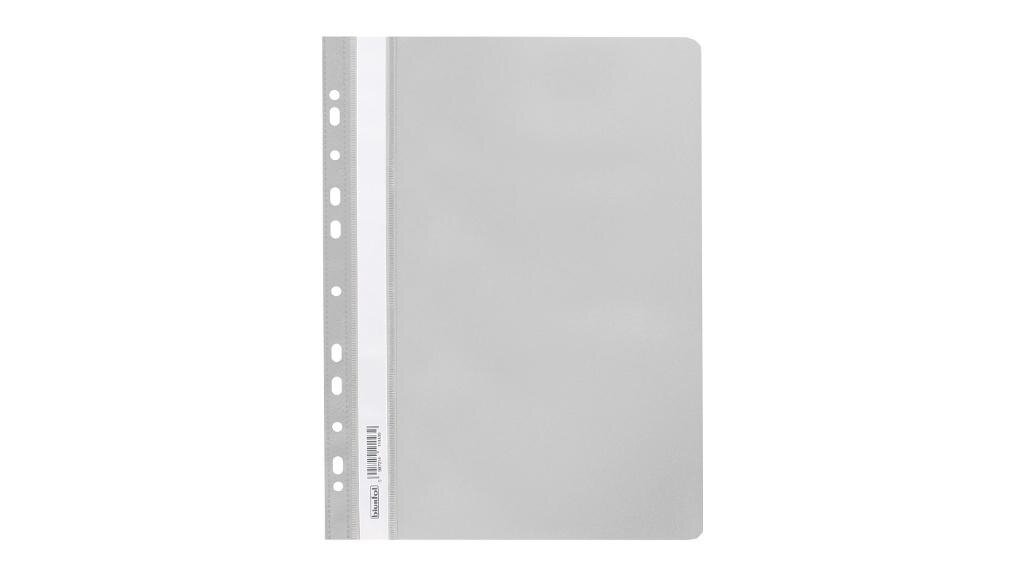 Skoroszyt wykonany z polipropylenu, miękki, przód przezroczysty, tył kolorowy. Europerforacja umożliwiająca wpięcie do segregatora z dowolnym ringiem. Wewnątrz klasyczny mechanizm z wąsem i listwą skutecznie zabezpieczający wpiętą zawartość; wąs o długości 14,5 cm. Na bocznej krawędzi wymienny, papierowy pasek do opisu zawartości z kodem kreskowym na szt. Dwa wycięcia ułatwiające wysuwanie paska. Zaokrąglone rogi obu okładek.
