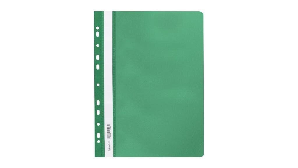 Skoroszyt wykonany z polipropylenu, miękki, przód przezroczysty, tył kolorowy. Europerforacja umożliwiająca wpięcie do segregatora z dowolnym ringiem. Wewnątrz klasyczny mechanizm z wąsem i listwą skutecznie zabezpieczający wpiętą zawartość; wąs o długości 14,5 cm. Na bocznej krawędzi wymienny, papierowy pasek do opisu zawartości z kodem kreskowym na szt. Dwa wycięcia ułatwiające wysuwanie paska. Zaokrąglone rogi obu okładek.