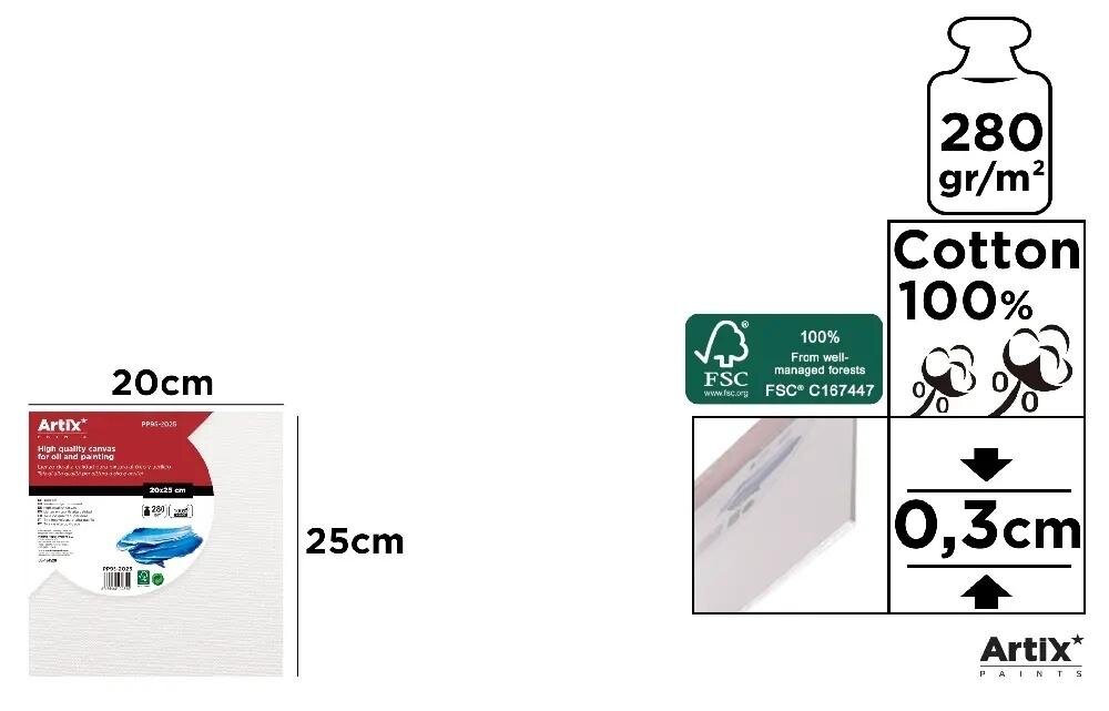 Mini płótno z drewnianą sztalugą. Płótno o gramaturze280 g/m2 wykonane w 100% z bawełny. Rozciągnięte na drewnianej ramie i zszyty dla lepszego mocowania. Wskazane do malowania olejnego i akrylowego.