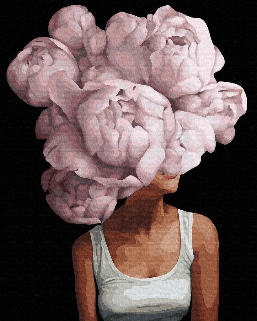 Kobieta z bukietem gigantycznych róż zamiast głowy. Obraz pełen lekkości, humoru i surrealizmu idealny do nowoczesnych wnętrz.