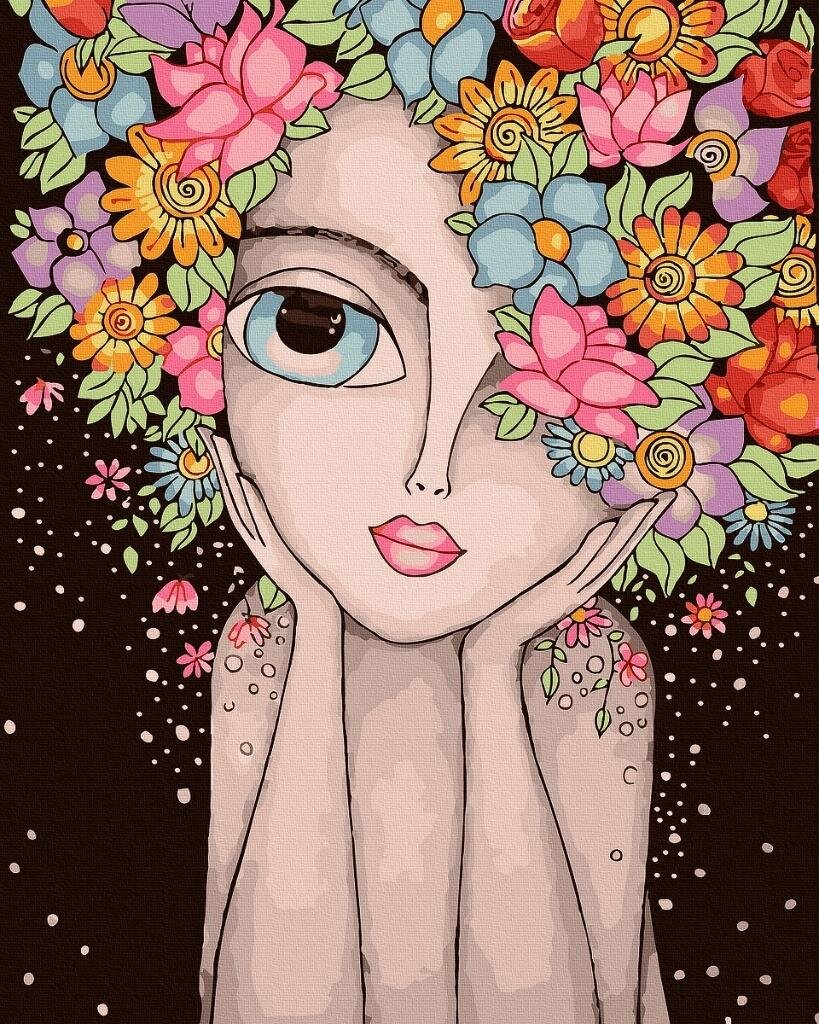 Uroczy, bajkowy portret dziewczyny z ogromnymi oczami i kolorową koroną z kwiatów. Idealna dla dzieci i wszystkich kochających radość.