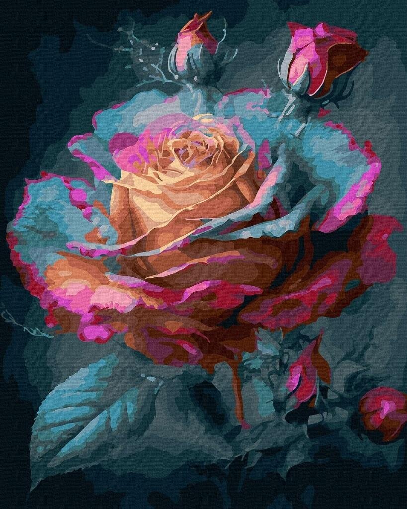 Romantyczna róża w niezwykłej kolorystyce róż, złoto i turkus. Elegancka dekoracja i relaksująca przyjemność malowania.