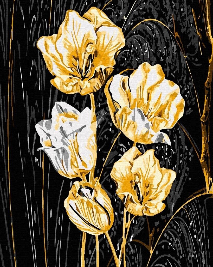 Stylowy kontrast złotych tulipanów na głębokim, czarnym tle tworzy elegancką i wyrafinowaną kompozycję. Ten obraz idealnie sprawdzi się jako dekoracja nowoczesnego wnętrza, wprowadzając do niego odrobinę luksusu i ciepła. Malowanie po numerach tej kompozycji to doskonały sposób na relaks i oderwanie się od codzienności.