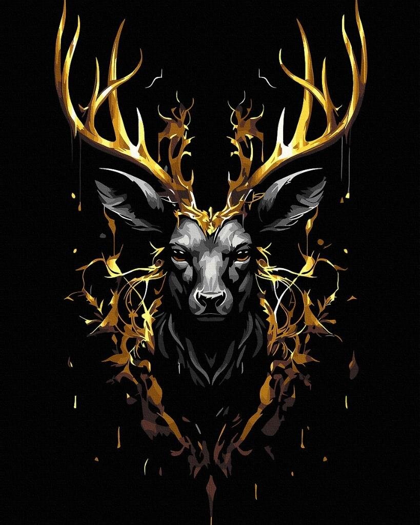 Monumentalny wizerunek jelenia z majestatycznym porożem, oplecionym złotymi, płomienistymi zdobieniami, to propozycja dla miłośników nowoczesnej i pełnej siły sztuki. Czerń tła kontrastuje z intensywnym złotem, co nadaje obrazowi elegancji i wyrazistości.