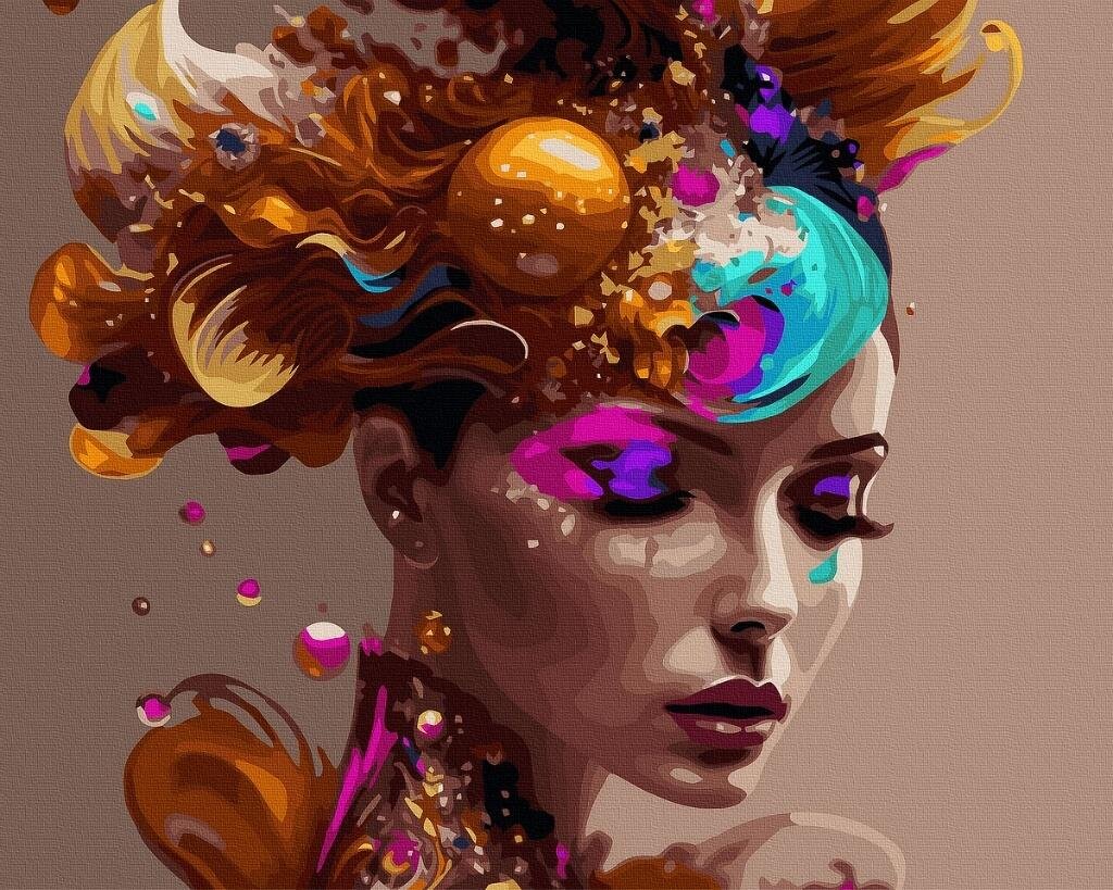 Zanurz się w świecie wyobraźni i koloru. Kobieta z zamkniętymi oczami otoczona jest eksplozją barw, które symbolizują marzenia i emocje. Ta obraz pełna fantazji zachwyca intensywnymi odcieniami pomarańczu, błękitu i fioletu.
