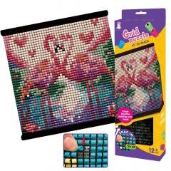 Flamingi - koralikowy wpinany obraz Obrazek powstaje poprzez wciskanie kolorowych koralików na elastyczne płótno. Ponad 2000 elementów Wymiar obrazka: 33 x 34.5 cm Wymiar opakowania: 11.5 x 5 x 37 cm Wiek 12+