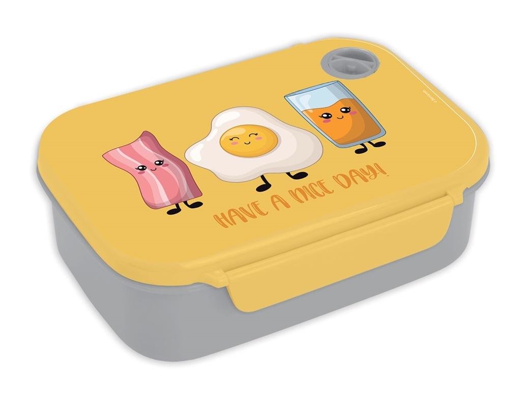 Pojemnik na śniadanie. Wykonany z plastiku - dolna część jednokolorowa,górna - wieczko z wielokolorowym nadrukiem. Zamknięcie plastikowe/zatrzaskowepodwójne na dłuższych bokach. Może służyć również do przechowywania drobiazgów.Nie jest dostosowane do podgrzewania w mikrofalówce, ani do mycia w...