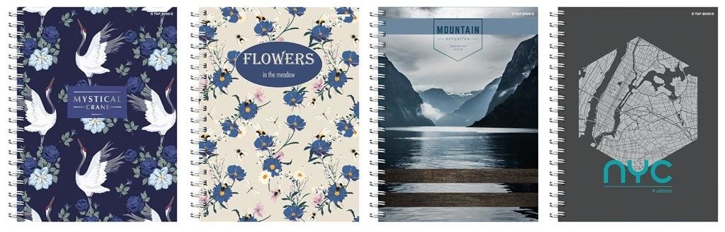 Opakowanie zbiorcze 5 sztuk.Miękkie, laminowane, kartonowe okładkiMix 4 różnych wzorów okładekPodwójna, metalowa spiralaFormat B5, 100 kartekPapier o gramaturze 60 g/m2