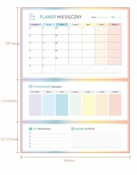 PLANER MIESIĘCZNY MAGNETYCZNY - kolorowy, dzielony na 3 części. Marka: Plan Your Life Wymiary: 60 x 45 cm Planer wyposażony jest w magnetyczny podkład, dzięki czemu można go ulokować na lodówce jak i każdej innej powierzchni metalowej. Planer ten znacznie ułatwi zaplanowanie obowiązków i najważniejszych wydarzeń nadchodzącego miesiąca, nadaję się zarówno do domu, szkoły czy biura. Mocny magnes i warstwowa budowa Silny magnes powoduje, że planer się nie zsuwa i nie przemieszcza podczas pisania. Wytrzymała powierzchnia z nanomateriałów ułatwiająca ścieranie - sprawi, że planer będzie Ci długo służył nawet podczas bardzo intensywnego użytkowania! Do każdego planera marker GRATIS.