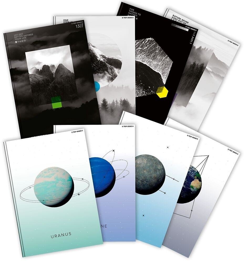 Wewnętrzne adresówki z kolorowym nadrukiem umożliwiają wygodne podpisanie zeszytów.