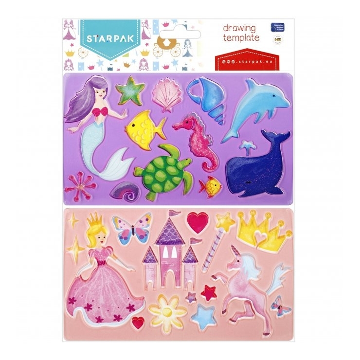 Szablon z kolekcji STARPAK Księżniczki. Szablon umożliwia dzieciom rysowanie precyzyjnych figur, kształtów a następnie zabawę, np. kolorowanie. Idealny podczas nauki poznawania nazw zwierząt czy planet. Wykonany z trwałego tworzywa. Zawartość zestawu: 2 x szablon.