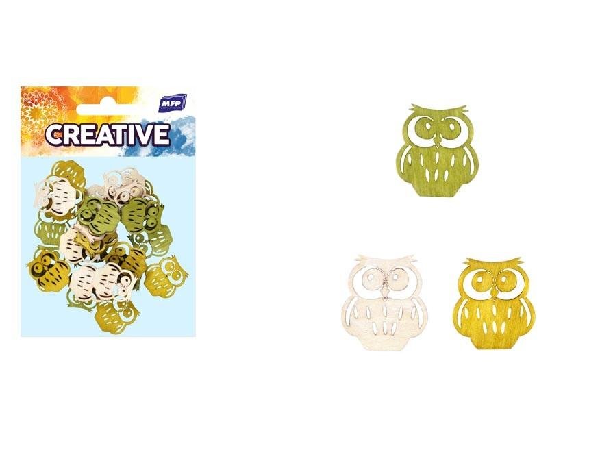 Dekoracja drewniana - świetna do wszelkich prac plastycznych. Można ją użyć do ozdabianie wianków i różnego rodzaju dodatków do wnętrz. Wykonana ze sklejki. Zapakowana w woreczek z zawieszką. Zestaw zawiera: - 24 szt. wycinanych sów