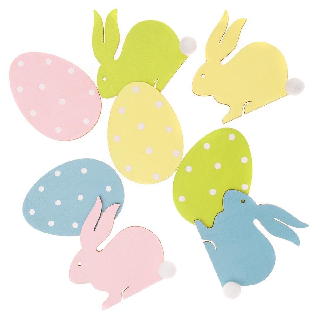 Pastelowy zestaw drewnianych kształtów z motywem króliczków z futrzanym ogonkiem i jajek z wzorem kropek.