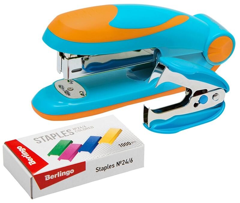 Zestaw Fuze zszywacz niebiesko-pomarańczowy 24/6, 26/6, rozszywacz i zszywki kolorowe, Berlingo