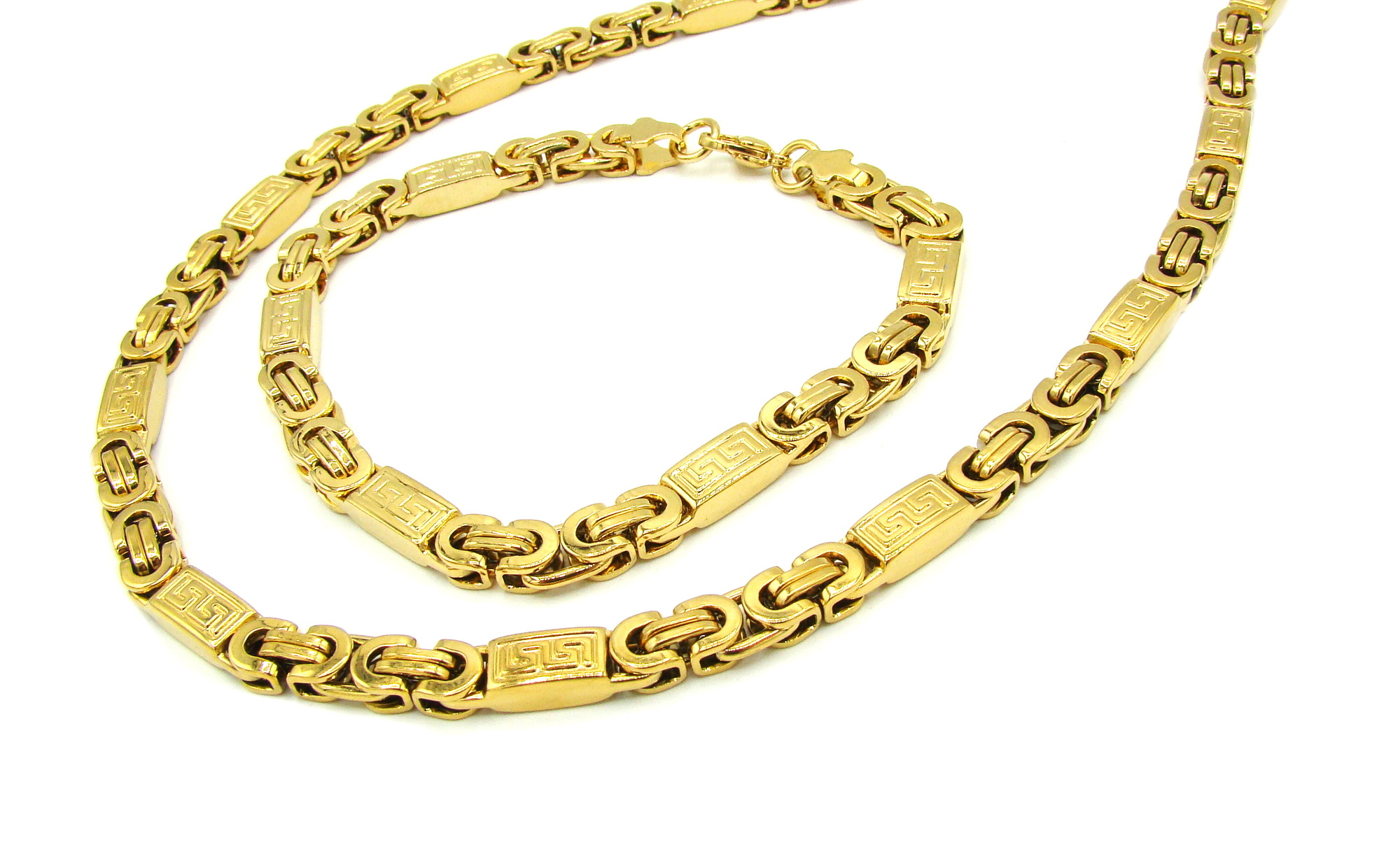 Materiál - chirurgická ocel. Materiál - chirurgická ocel - hypoalergenní (mohou ho nosit i lidé s alergií na bižuterii nebo stříbro). Souprava je vytvořena z materiálu, který je známý pro svou odolnost. Souprava z chirurgické oceli je hypoalergenní, tzn., že nevyvolává žádné alergické reakce. Souprava - chirurgická ocel je barevně stálá a nemění svoji barvu a je vysoce odolná vůči otěru a poškrábání. Šperk je vhodný na denní nošení. Souprava je klasikou vhodnou pro každodenní nošení včetně kontaktu s vodou.Krásná souprava z chirurgické oceli - viz foto. Barva zlatáŘetízek je v délce cca 55 cm, náramek v délce cca 22 cm a šíře cca 6 mm. Zapínání - karabinka.