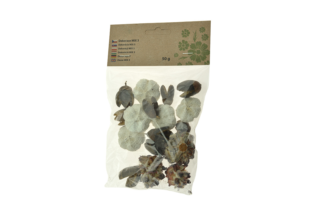 Mix sušené dekorace se skládá z 3 ks pubescens small, 15 g pau terra estrela a 15 g parras white. Sušina je vhodná k aranžování a dekoracím. Hmotnost: 50 g.