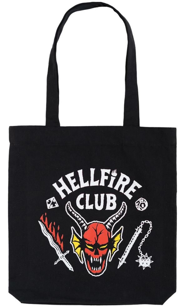 Černá shopping taška na rameno inspirovaná Hellfire Clubem z oblíbeného amerického sci-fi mysteriózního seriálu Stranger Things.
