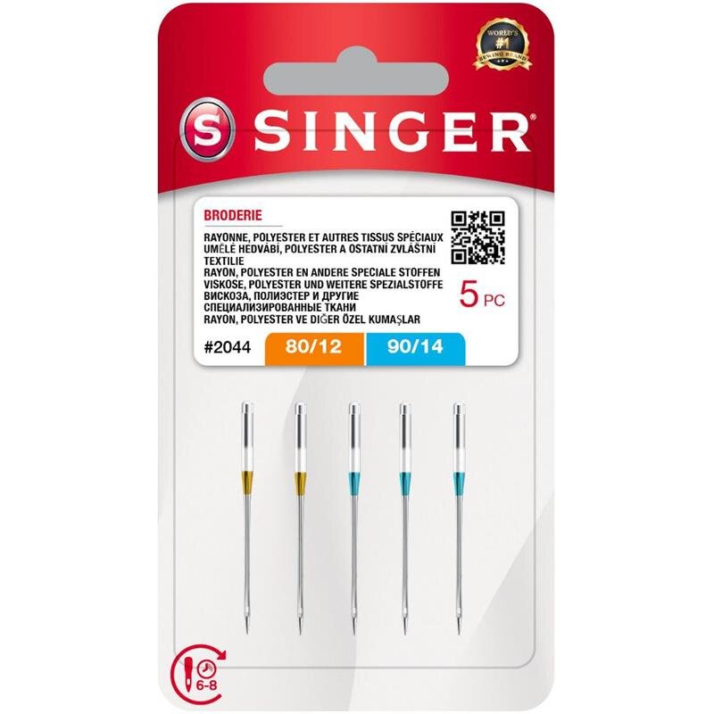 Vyšívací jehly Singer 2044 ASST BLST W/05 jsou speciálně navrženy pro ozdobné šití a vyšívání s metalickými a speciálními nitěmi. Tyto kvalitní jehly pro šicí stroje se vyznačují zvláštním zkosením, lehce zaoblenými hroty a větším okem, které zabraňuje poškození nití i látky během práce. Balení obsahuje 5 jehel v různých velikostech - 2x 80/12 a 3x 90/14, což vám umožní pracovat s různými typy materiálů a projektů.