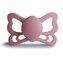 Tvar cumlíka FRIGG Butterfly pripomína motýľa. Štít so zvlnenými okrajmi má veľké vzduchové otvory pre väčšiu bezpečnosť a jeho okrúhly stred krásne zvýrazňuje eleganciu cumlíka.