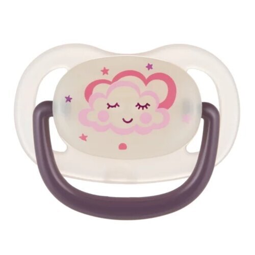 Smoczek uspokajający NIGHT DREAMS wykonany z najwyższej jakości, bezzapachowego i bezsmakowego silikonu. Wyposażony został w gumkę o anatomicznym kształcie. Smoczek dobrze odpowietrza się, dzięki specjalnym otworom wentylacyjnym na tarczce. Posiada świecącą tarczkę, która ułatwia znalezienie smoczka w ciemności. Nie zawiera BPA. Dostępny w kilku kolorach. Przeznaczony dla dzieci w wieku 0-6 miesięcy.