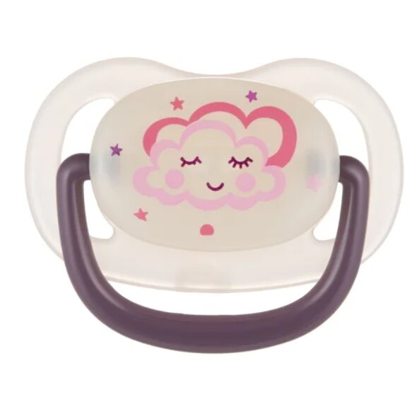 Smoczek uspokajający NIGHT DREAMS wykonany z najwyższej jakości, bezzapachowego i bezsmakowego silikonu. Wyposażony został w gumkę o anatomicznym kształcie. Smoczek dobrze odpowietrza się, dzięki specjalnym otworom wentylacyjnym na tarczce. Posiada świecącą tarczkę, która ułatwia znalezienie smoczka w ciemności. Nie zawiera BPA. Dostępny w kilku kolorach. Przeznaczony dla dzieci w wieku 6-18 miesięcy.