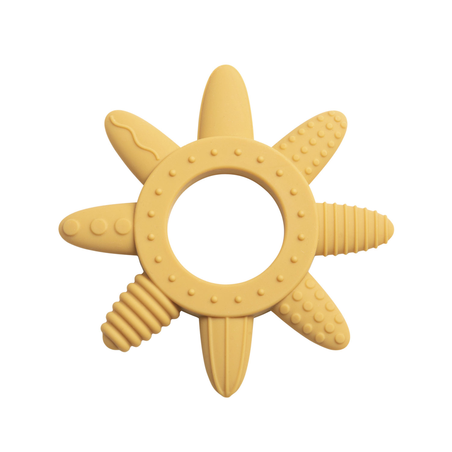 Silikonové kousátko ve tvaru zářivého sluníčka má každý paprsek s jiným