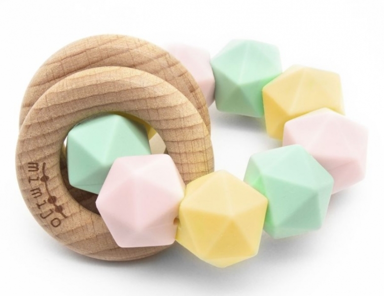 Korálky jsou vyrobeny z potravinářského silikonu. Součástí chrastítka jsou dva dřevěné kroužky vyrobené z bukového dřeva. Ideální pro bolavé dásně, napomáhají k prořezávání prvních zoubků.