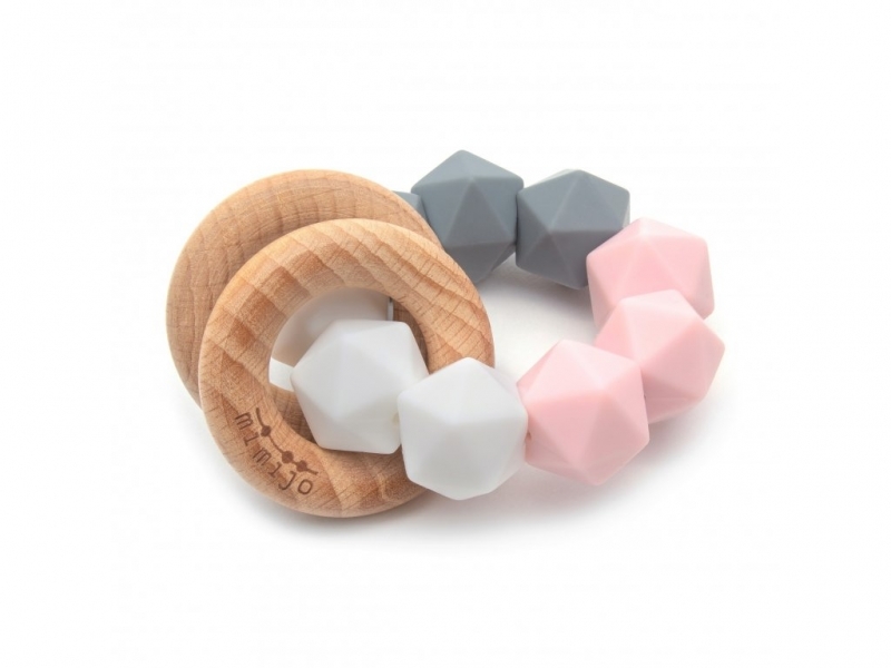 Silikonové kousátko a chrastítko 2v1 Tina Mimijo s dřevěnými kroužky - bílá/růžová/šedá