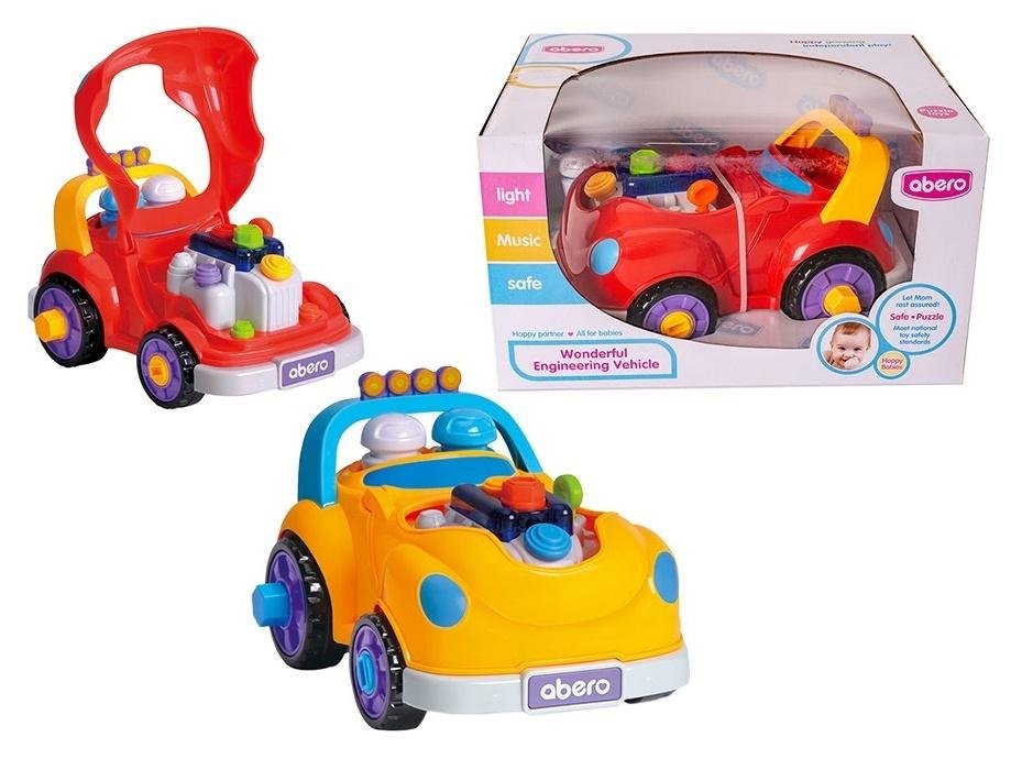 Autko (21 cm) z dźwiękiem i muzyką.Figurki kierowcy i pasażera to zarówno śrubokręt i klucz do umieszczonych na samochodzie elementów. Podnoszona maska.Każdy z przycisków uruchamia inny dźwięk (alarm, uruchamianie silnika, przelewana woda).Dostępne 2 kolory - czerwony, żółty. Towar wysyłany losowo.