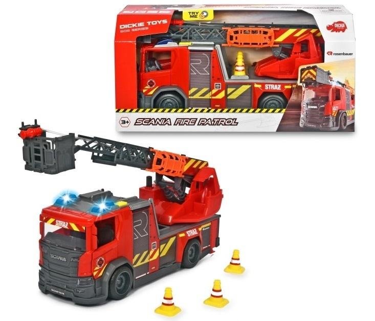 Straż pożarna z drabiną należy do kolekcji pojazdów ratunkowych SOS niemieckiej firmy Dickie. Ten fantastyczny duży samochód strażacki Scania Rosenbauer\'a wprowadzi małego strażaka w świat wielkich przygód i niezapomnianych wrażeń. Wiernie odwzorowany samochód z funkcją światła i dźwięku oraz obrotową i wysuwaną drabiną z koszem ratowniczym, z pewnością zachwyci swoimi funkcjami. Każdy szczegół wykonany jest z niezwykłą precyzją, dlatego zabawa tym wyjątkowym wozem strażackim przyniesie wiele radości.