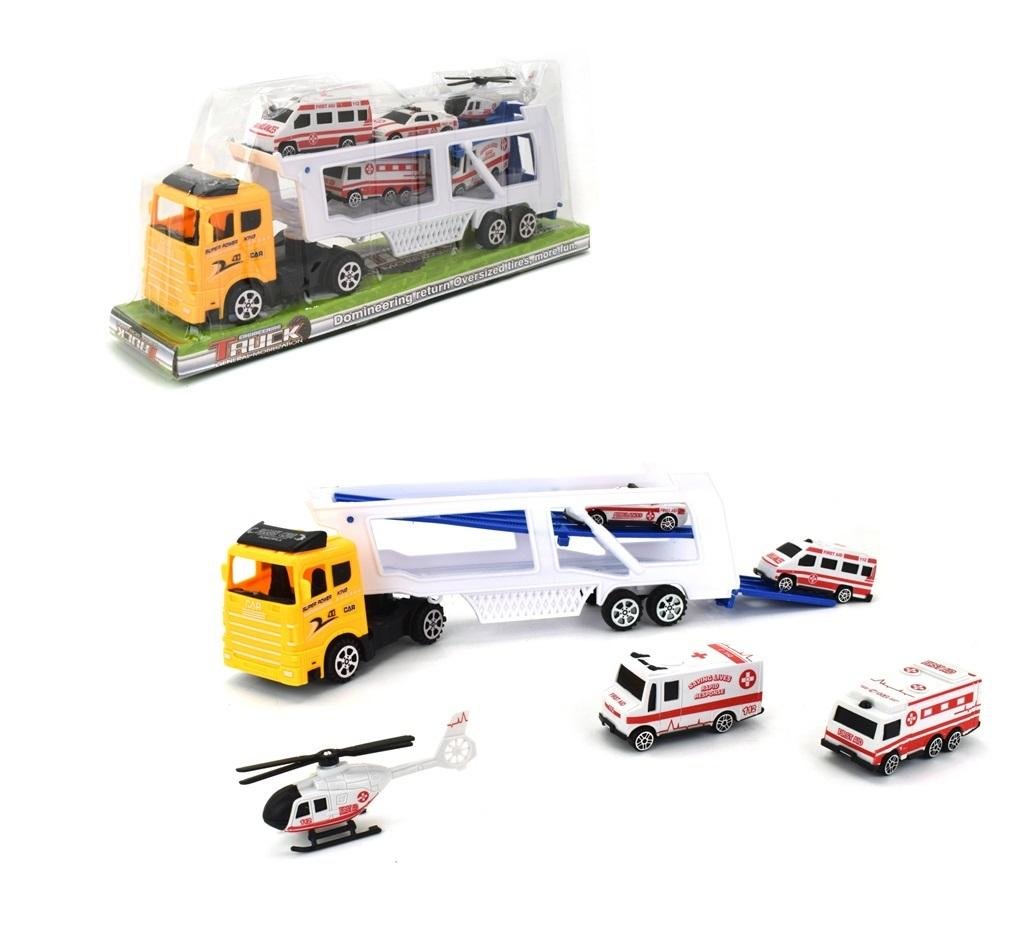 Ciężarówka z lawetą dwupoziomową to masa zabawy dla każdego dziecka. Lawetę można wykorzystać do przewozu ratunkowych autek z zestawu lub innych pojazdów. Lawetę można odczepić od ciężarówki, a górna rampa i tylna klapa jest rozkładana, tak aby górne autka mogły swobodnie zjechać. Opakowanie typu Window Box ułatwia zapoznanie się z funkcjami zabawki.