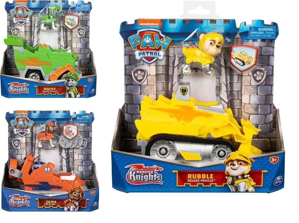 Połącz siły z Chase\'m i weź udział w ekscytujących misjach z jego pojazdem delux w wersji Psi Patrol Odważni Rycerze. Pojazd Chase\'a posiada detale i stylizację inspirowaną smokami oraz ekscytującą transformację narzędzi ratunkowych. Ubrany w zbroję Odważnych Rycerzy Chase (w zestawie figurka kolekcjonerska) jest gotowy, aby uratować sytuację w Barkinburg. Gdy przyjaciel smok ma kłopoty, posadź Chase\'a za kierownicą i ruszaj na ratunek. Naciśnij spojler, a z tyły wyskoczy wyrzutnia. Załaduj pociski (dwa w zestawie) i naciśnij przycisk, aby wystrzelić! Wykorzystaj swoją wyobraźnię, aby tworzyć niesamowite, średniowieczne akcje ratunkowe. Dokładnie takie jak z serialu telewizyjnego. Aby bawić się jeszcze lepiej, zbierz zestaw z zamkiem oraz wszystkie pojazdy delux Psiego Patrolu w wersji Odważni Rycerze (zestaw i pojazdy sprzedawane osobno). Przygotuj się na misje ratunkowe z Chase\'m i jego pojazdem delux z serii Odważni Rycerze!
