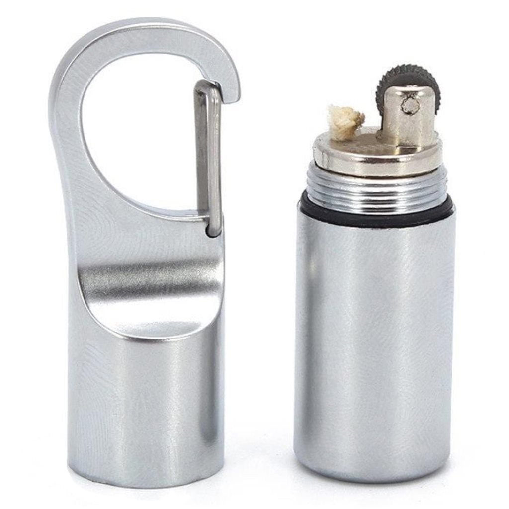 Malý a lehký zapalovač ve vodotěsném nerezovém pouzdře. Disponuje gumovým těsněním a šroubovacím víčkem. Víčko je navíc v horní části opatřeno karabinkou. Dodáván bez naplnění.