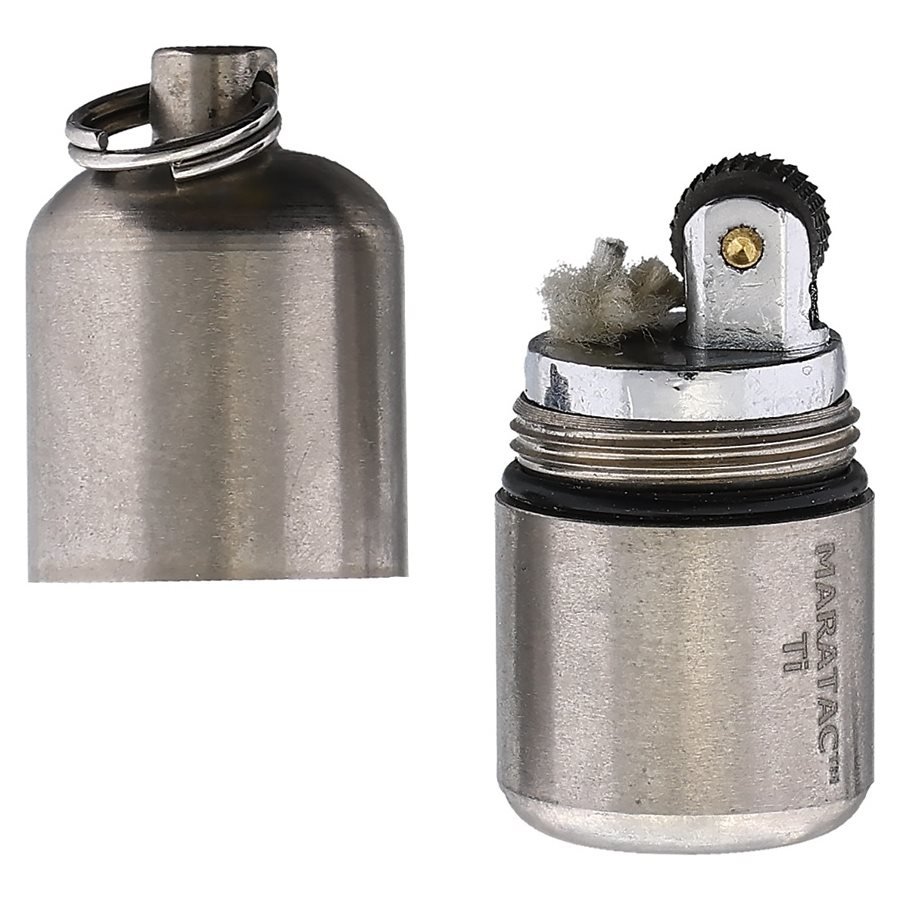 Zapalovač, který je uložený v titanovém vodotěsném pouzdře. Malý, lehký, odolný, spolehlivý. Rozměry - cca 3,3 x 1,3 cm.