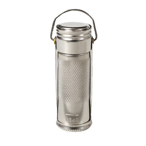 Kovová krabička na zápalky, víčko s vodotěsným těsněním, poutko pro připevnění např. ke klíčům. Výška cca 6,3 cm. Dodáváno bez zápalek.