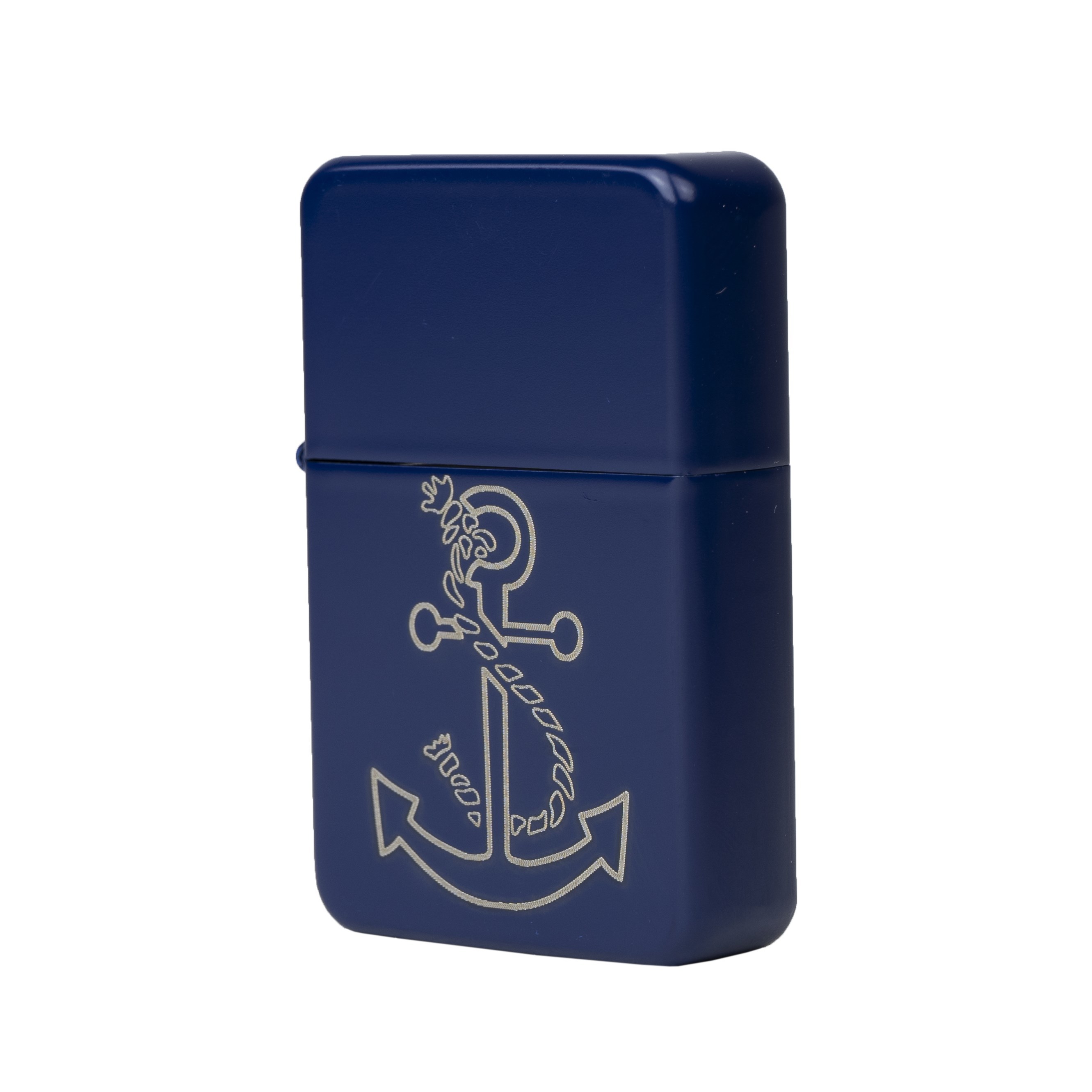 Benzinový kovový zapalovač s kotvou uprostřed přední strany. Kotva je na zapalovači vygravírovaná. Rozměry zapalovače: 57 x 38 x 13 mm. Benzín není součástí. Povrch zapalovače je modrý, matný.