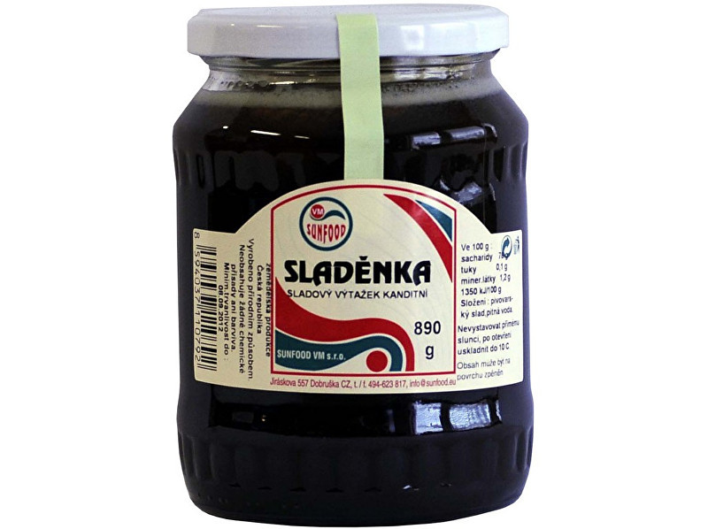 Vyrobeno přírodním způsobem. Neobsahuje žádné chemické přísady ani barviva. Vyrobeno přírodním způsobem. Neobsahje žádné chemické přísady ani barviva. Ječmenný slad je zdravou náhražkou klasického bílého cukru, který nestimuluje slinivku, tudíž šetří naše tělo a je vhodné pro diabetiky. Neobsahuje chemické látky a jeho konzistence je podobná medu. Lze jím sladit Vaše oblíbené pokrmy a nápoje.Složení: ječmenný slad, pitná voda.Obsah: 890gVýživové údaje na 100 g:Energetická hodnota 1350 kJ/ 323 kcalTuk 0,1 gz toho nasycené mastné kyseliny 0 gSacharidy 74,6 gz toho cukry 61 gBílkoviny 7,0 gSůl 0,01 g