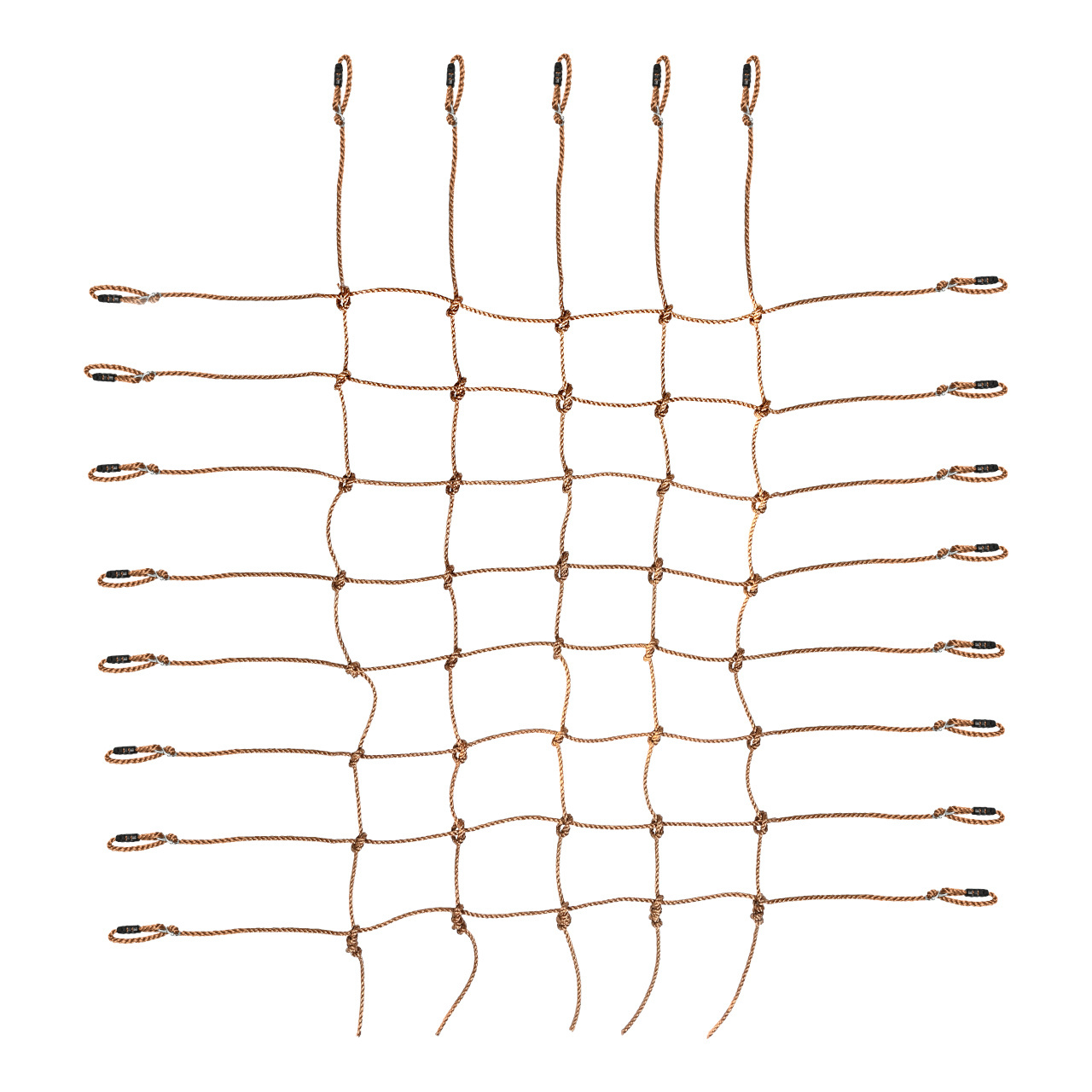 Šplhací síť je vyrobena z příjemně poddajného, ale zároveň odolného lana, které umožňuje upravovat velikost ok dle potřeby. Robustní plastové objímky a kovové průvlaky zajišťují spolehlivé a bezpečné upevnění na rám o doporučených rozměrech 130×200 cm. S nosností až 100 kg je vhodná pro děti od 3 let a je testována tak, aby unesla i náročnější hraní a skákání.