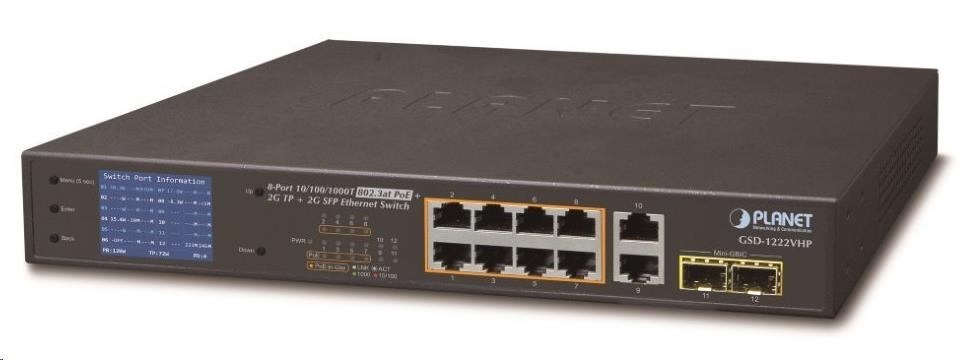 Planet GSD-1222VHP Switch, 8x PoE + 2x 1000Base-T + 2x SFP, LCD,VLAN, extend mód 10Mb do 250m, IEEE 802.3at 120W